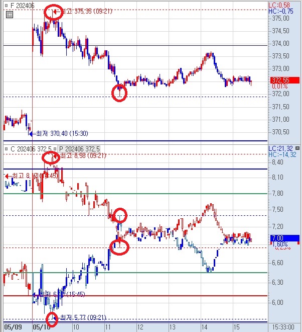 - 11시 30분 : 콜옵션 372 상대 야저 6.90 지지, 풋옵션 372 상대 야고 7.25 찍음