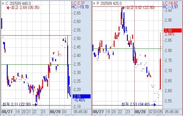 1) 콜옵션 440 2.35 시작하여 전종가 2.49 회복 못하고 하락 부터 진행 야저 2.11 저점을 직고 상승 고점