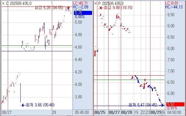 1) 양 435를 확인하면 야종가 콜옵션 435 5.15 , 풋옵션 435 5.52 로 5.30 교차를 확인