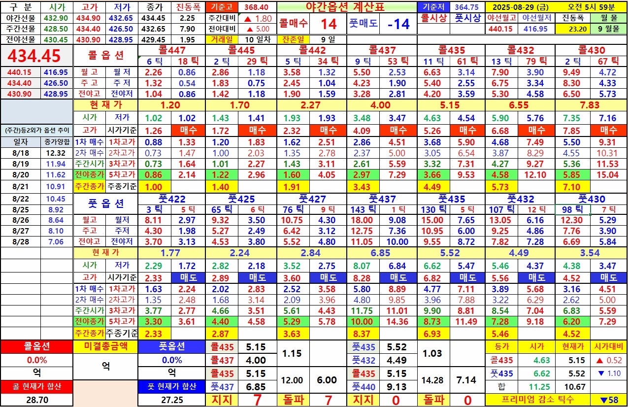 8) 선물 하락시 : 풋옵션 435 상대 월고 6.57 회복 → 풋옵션 432 상대 전고 6.75 까지, 콜옵션 432 상대 야고