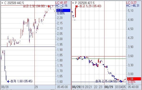 1) 콜옵션 442 1.93 시작하여 야저 1.93 시가 저가 저점을 찍고 상승 하였고 전고 2.45 회복 못하고 야고 2.32