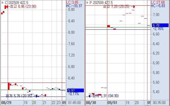 8) 선물 하락시 : 풋옵션 422 상대 월저 5.38 회복 → 풋옵션 422 상대 야저 5.76 까지, 콜옵션 422 상대 야고