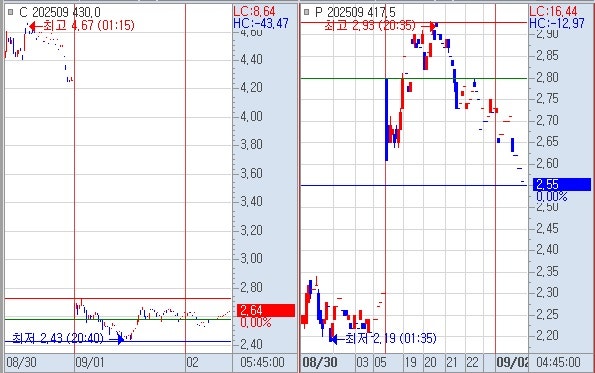4) 풋옵션 417 하락할 때 야저 야종가 2.55 아래에서 시작하여 야고 전종가 2.93~2.95 회복 못하고 하락 전저