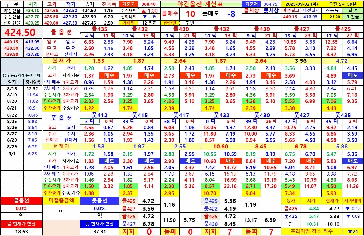 7) 선물 상승시 : 콜옵션 425 상대 야고 5.83 회복 → 콜옵션 425 상대 전고 6.86 까지, 풋옵션 425 상대 야저
